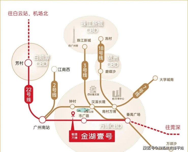 交通动脉:22号线(已开通)及26号线(规划中)双地铁交汇,约800米市广路地铁站, 1站番禺广场、2站万博中心,3站琶洲CBD、4站珠江新城。