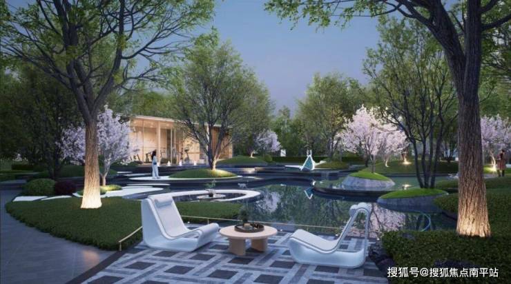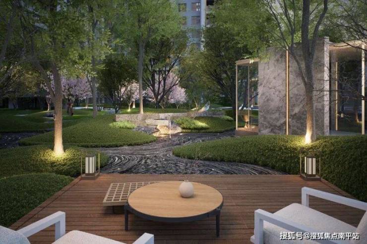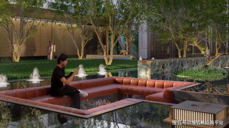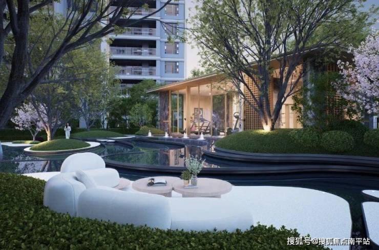 「水幕会客厅」:紧邻约300㎡中心水苑,半开放式廊架搭配临水花台,营造松弛天地