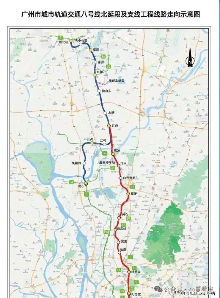 距地铁8号线北延段(在建)雅源站,直线距离约550米(数据来源:百度地图),2站到白云,3站到广州北站;