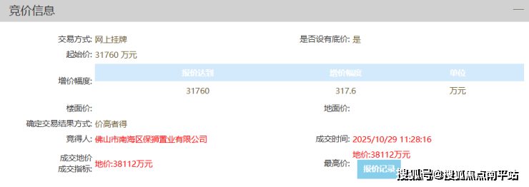 第19轮后,报价开始放缓,【11:23】最新报价38112万元,楼面价5232元/㎡。