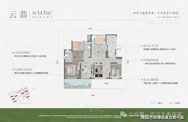 143平,首层架空层.四开间朝南,主卧南向带19平景观阳台,面积更宽绰.景观阳台全赠送+飘窗全赠送+北向阳台赠送,拓展面积套内约150平,优化后实际得房率约105%.