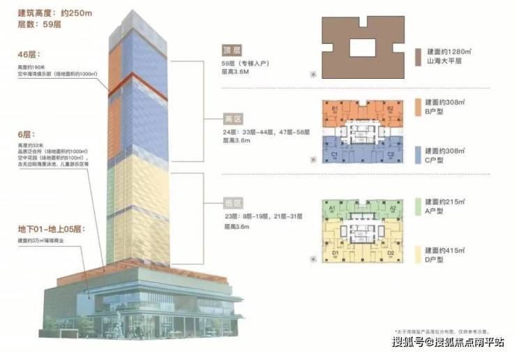 户型分布在高区33-47层,4个户型朝向,也可以两套打通做620㎡大户型,东南跟西南主要看海景,西北跟东北斗可以看部分海景+大小南山景观