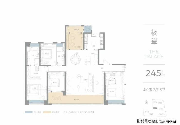 建面约225㎡户型: 3+1房2厅3卫,经典南北双阳台格局,双套房朝南设计,餐客厅一体形成超大方厅。