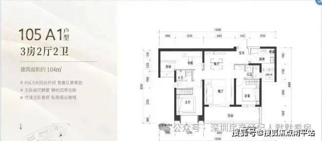 105㎡:竖厅格局,客厅与卧室连通超大阳台,LDK一体化设计,主卧室270度转角飘窗,看城市景观,主要朝向为西南和东南