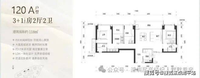 120㎡:客厅与卧室连通9.6㎡超大阳台,主卧带5.2㎡衣帽间,还有观景小阳台,主要为东南和西南朝向