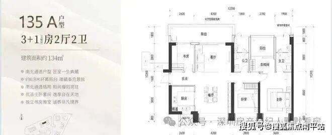 135㎡:横厅格局,南北双阳台设计,9.8㎡南向主阳台,三个房间面积分别达到9/11/15㎡,主卧带衣帽间和卫生间,舒适度非常好。