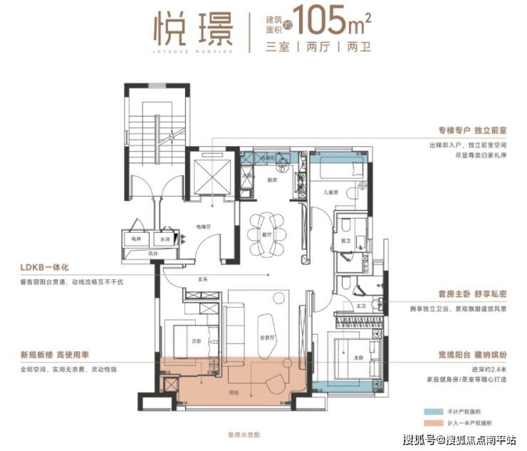 起步户型, 105平小高三房。专梯专户,独立电梯厅。