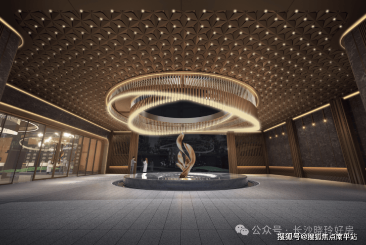 呼应浏河的流水形态,以星耀灰奢石材融合深香槟色铝板,勾画与街区一体的奢尺恢弘门庭,一处庭前星空顶大堂“车马院”,俨然一座高星级酒店入口,名门风范不彰自显。