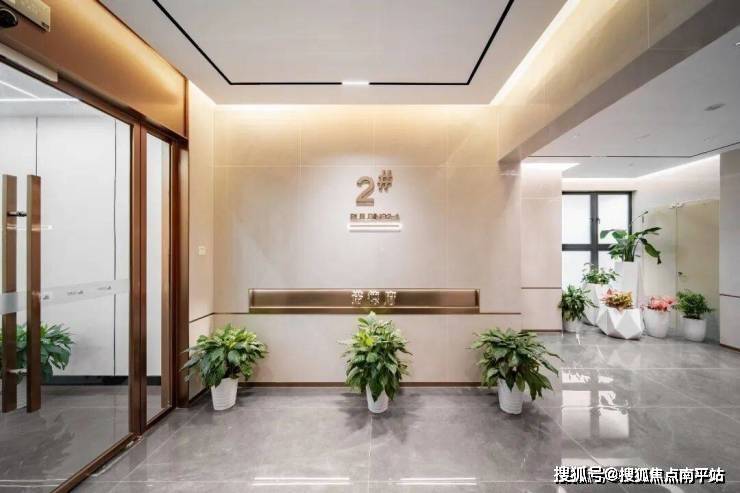 • 双奢入户大堂、格调花纹岩板、大块瓷砖铺贴、格栅吊顶+灯带