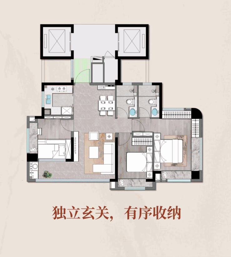 ● 2梯2户,私享电梯明厅,约3.45米宽入户玄关柜