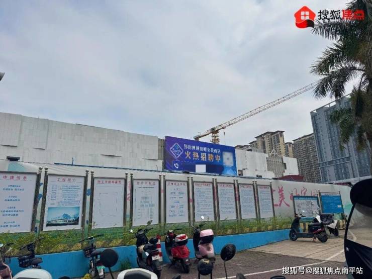 现场可以看到,有工人正在进行外立面施工,并贴出招聘广告。