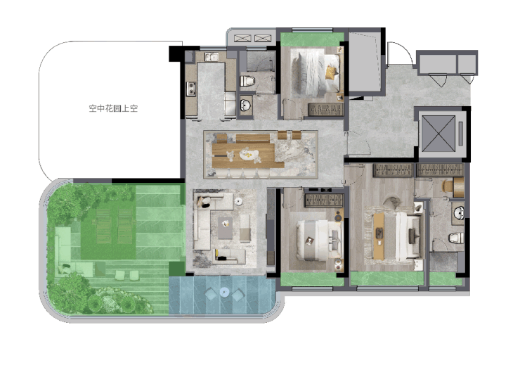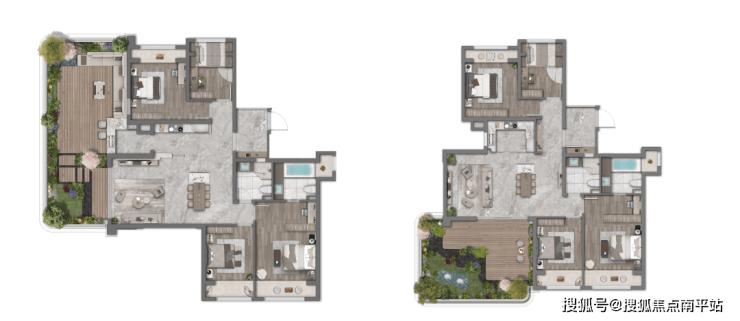 除了超大空中庭院之外,还拥有四房两厅三卫双套设计,餐客厅一体化的LDKG大方厅,开间超6m,面积更达到了近50㎡,超级X空间可以根据需求任意变换成茶室、瑜伽房、儿童乐园等,而双套房也被分开放在两个端头,兼顾了功能性和生活私密度。
