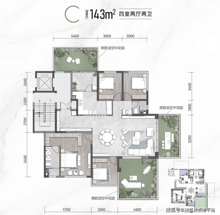 偶数楼层143㎡经典三叶草户型,私密舒阔卧室,起居互不相扰。LDKBG一体化设计,动区面积超 70m,满足高效丰富的生活场景。更有3+1灵动格局,可轻松幻变四房,应对家庭成员增长与多元空间需求。约16m空中花园,一半绿化种植,实现比肩院墅的生态享受。