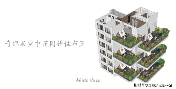在错层的基础上,上下层的空中花园,使用绿化和半透栏板遮挡视线,避免对视的尴尬,并且,在上层住户的窗户前增加飘板,避免室内一眼看透,保证私密性。
