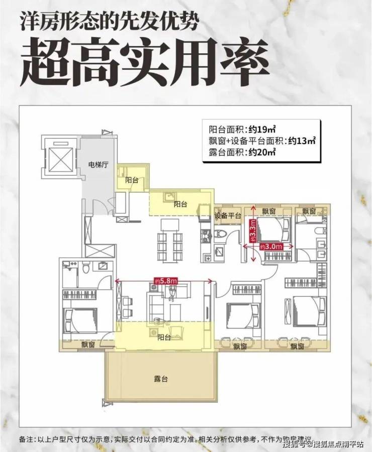 户型全屋赠送或半赠送3个飘窗+1个设备平台+3个阳台,得房率匹敌常规170平户型,性价比极大提升。两梯两户的纯板楼,每户独享约6㎡的私家电梯厅,私密性和尊享感直接拉升。