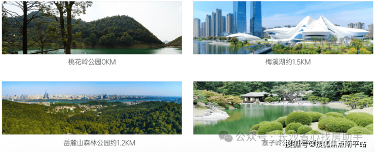 项目背靠梅溪湖坐落于麓山文脉之上,呈三面环山(桃花岭、岳麓山、寨子岭)之势 ,梅溪湖城市公园、桃花岭公园、岳麓山风景区、寨子岭公园、大科城三公园—古人塘公园、桃花溪公园、麓人湖公园(规划中)多公园环绕,打造项目最纯粹的静谧城市山居生活。