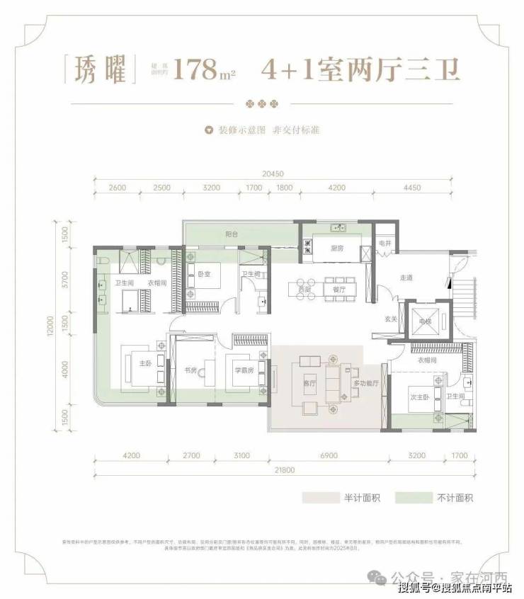 建面约178㎡户型:4+1房两厅三卫,南向面宽21.8米。