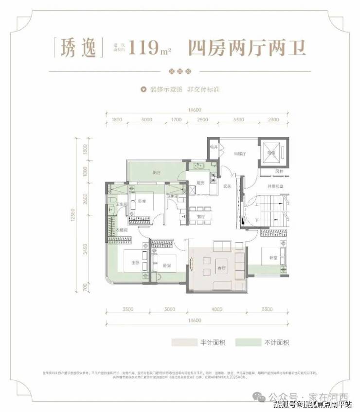 建面约119㎡户型:四房两厅两卫,实得面积超128平(含电梯厅),相当于以前的160平户型,二孩改善家庭都能轻松满足。