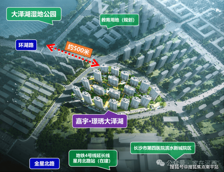 更绝的是,项目距离大泽湖湿地公园直线距离仅约500米,房子北面刚好是教育用地,不会遮挡视野。