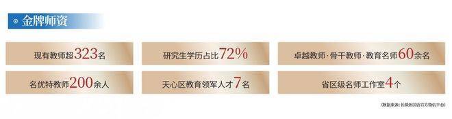 长郡外国语实验中学现有教师约330人,其中72%为研究生学历。共有4个省区级名师工作室,拥有名优特教师200余人,市级卓越教师、骨干教师、教育名师60余人。2024年,7名教师被认定为“天心区教育领军人才"。