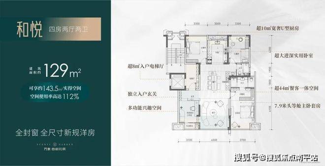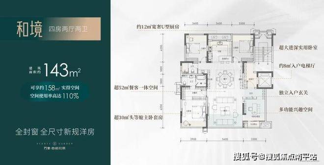 实际使用面积约143.5平,得房率约112%,私梯入户+洋房,吊打市面上一众新规产品。