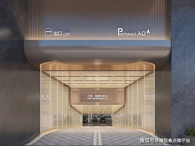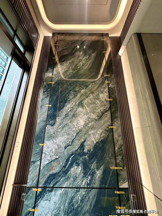 首层入户大堂,内部挑高约6米;负一层大堂约3.5-4米,背景墙全部采用大面积岩板和不锈钢装饰,连拼接处的图案都是一致的。