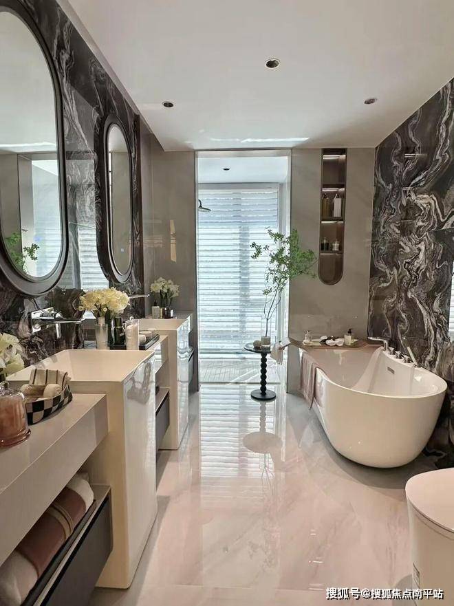 约50平的客餐厅、南向双套房、约38平的头等舱主卧(既有内玄关,还有步入式衣帽间、梳妆台、双台盆、浴缸...),