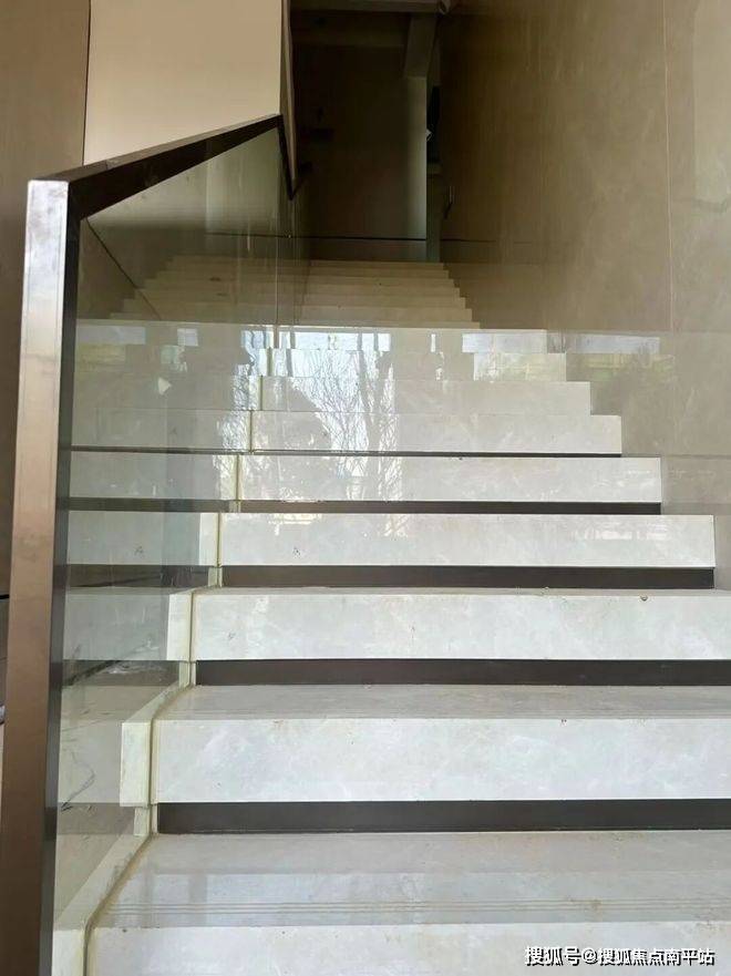 4、消防楼梯的栏板,一般楼盘都是不锈钢栏板,项目则用的是安全玻璃,空间更通透明亮,也更美观。