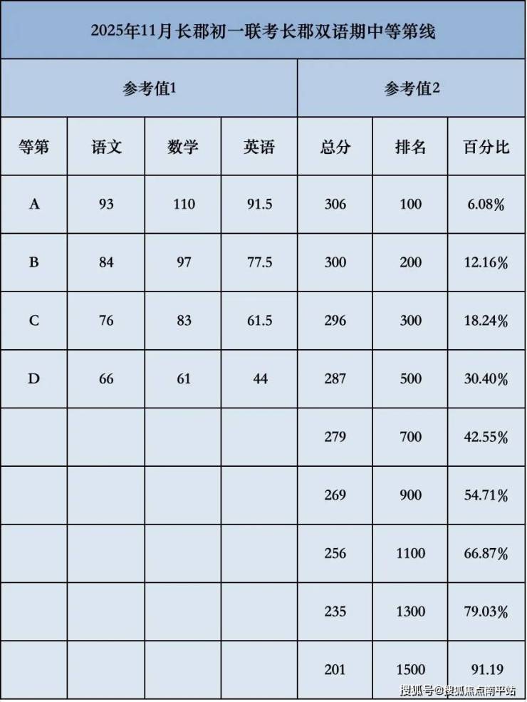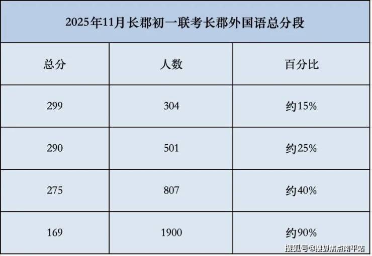 2025年11月份长郡系初一联考,长郡外国语本部老校区与南校区合并统计。前15%分数段,郡外略微强于长郡双语;前40%分数段,两者大体相当,长郡双语微有优势。