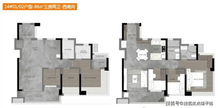 86方三房两卫的户型, 主人房的飘窗也是打掉了更多,只留下30公分。实用性会更强。
