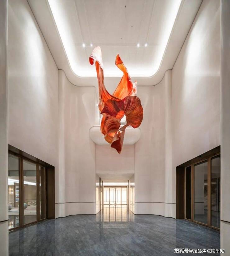 这里挑高约9米,空中「悬浮」着一件以和纸贴合金属骨架打造的大型艺术装置,形似飘逸的月季花瓣。