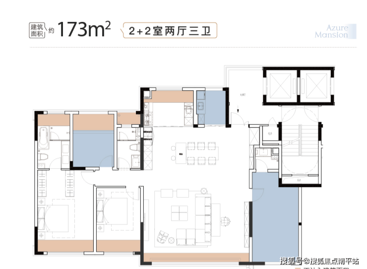 【城市奢居雅舍】:2+2房三卫,四开间朝南布局,南向三卧室搭配可灵活改造空间,可因需改为书房、卧室或阳光房,主客分区尊贵风仪。