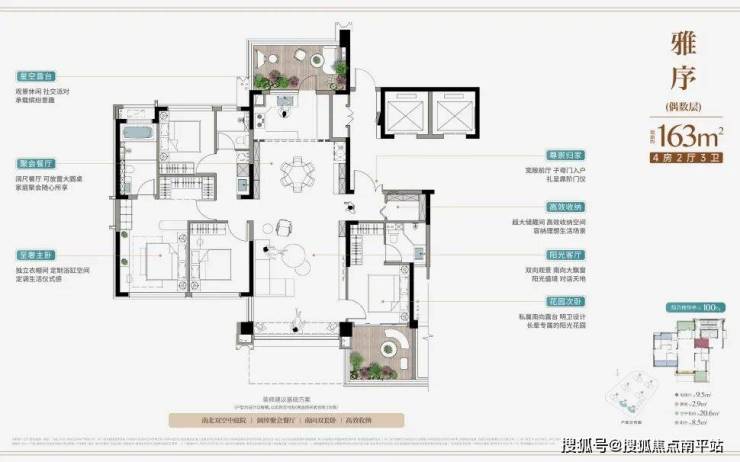 建面约163㎡,以其独特的设计亮点,在高改市场中脱颖而出。 类独梯独户的设计,加码居住的私密性与尊崇感, 入户带独立储藏间,让生活空间更加整洁有序。 户户私享空中露台,为生活增添了一份浪漫与诗意, 四房三套卧等尺度配置,让这个户型空间功能更加完善。