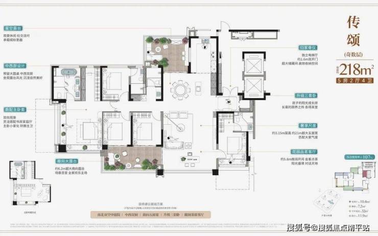建面约218㎡: 综合使用率超100%, 独立私属电梯厅+约1.6米入户双开门设计,彰显大宅风范。 约5.8米轩敞会客厅无缝融合 雅致茶室,社交与闲逸随心切换; 餐厅配设中西双厨,轻松承载多元饮食需求。 高配五房规划,奢享三套卧设计,尺度尽显尊崇。 南北双露台加持,完美适配多代共居的幸福日常。