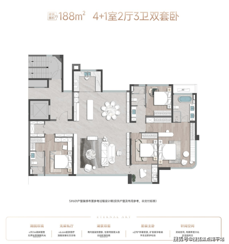 比如建筑面积约 188 ㎡四室两厅三卫, 得房率高达约 94.12% ,实际面积超 218 ㎡,以超越的尺度,带来居住体验的跃级。