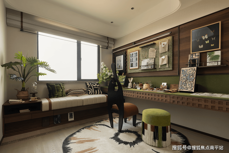 在草木的治愈色调里,女主人铺开画纸,蘸着颜料勾勒窗外的景色,孩子趴在旁边的地毯上,用彩笔涂涂画画,偶尔举起作品问:“妈妈,你看我的小蝴蝶像不像卧室墙上的那只?”