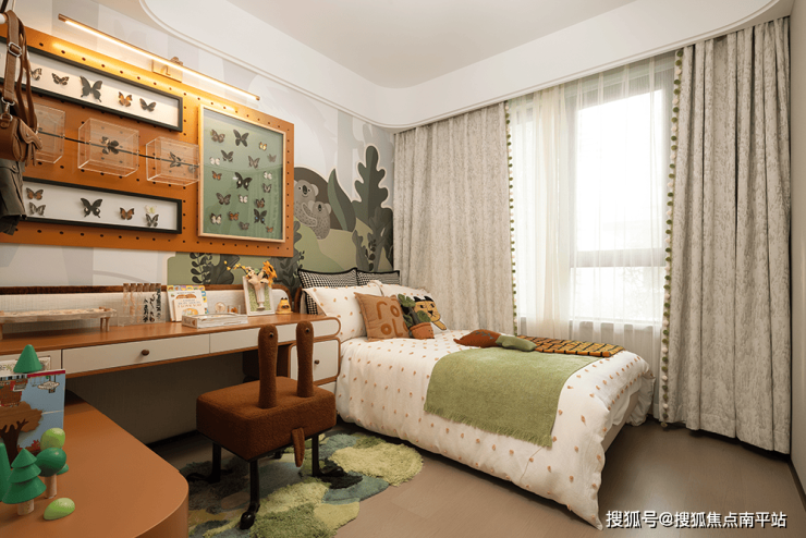 儿童房是一座破土而出的童话森林。墙面之上,蝴蝶似童年本身——永远在蜕变,永远保留着对世界最初的好奇与温柔。嫩绿与深绿交织的地毯,如苏醒的苔原,托起稚嫩脚步与天马行空的想象。