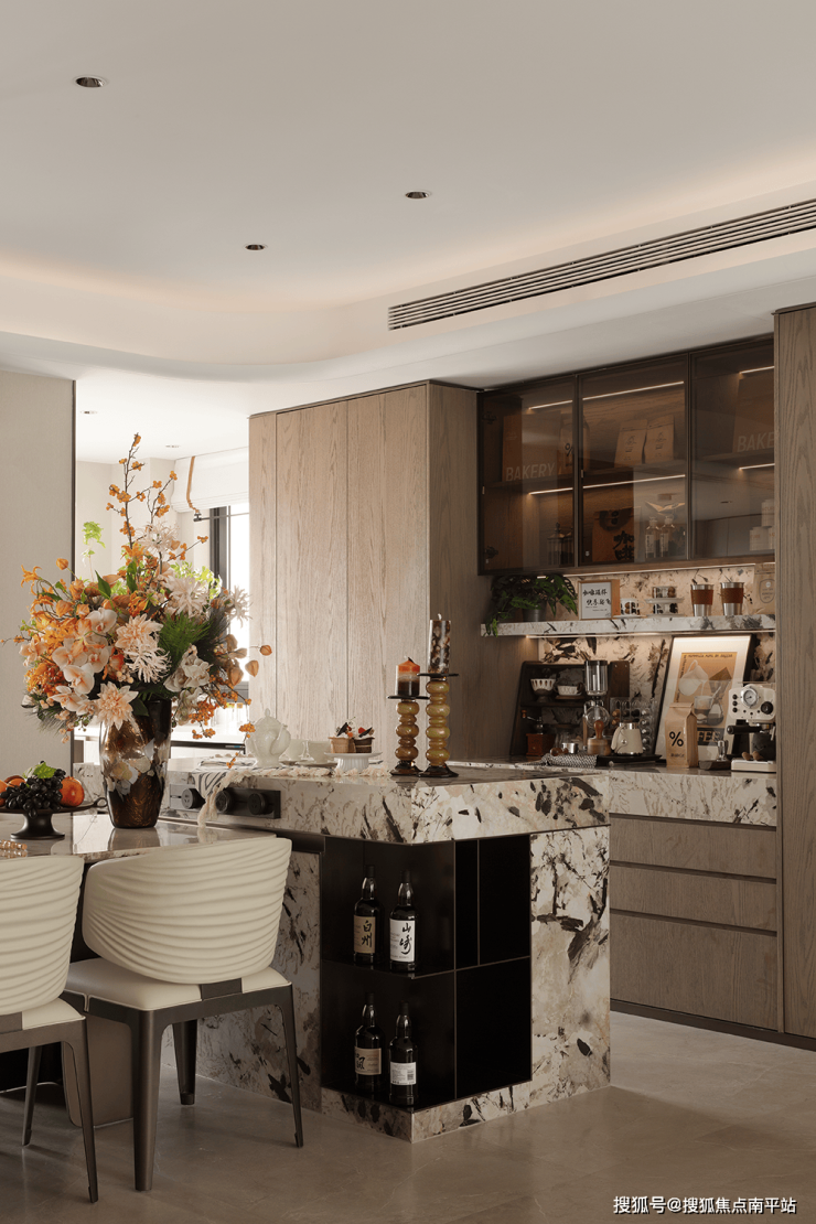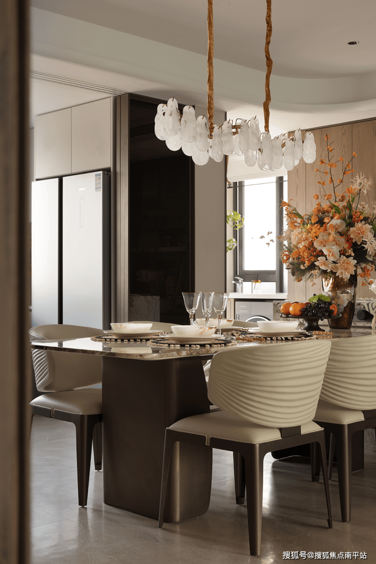 餐厅延续温润底色,云雾琉璃灯漫洒暖光,皮质雕花椅静立两侧,奢石金属餐桌承载三餐烟火。与厨房相连的开放式布局,让家的暖意不受阻隔,自由流淌。