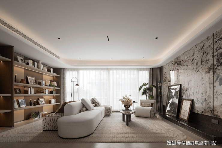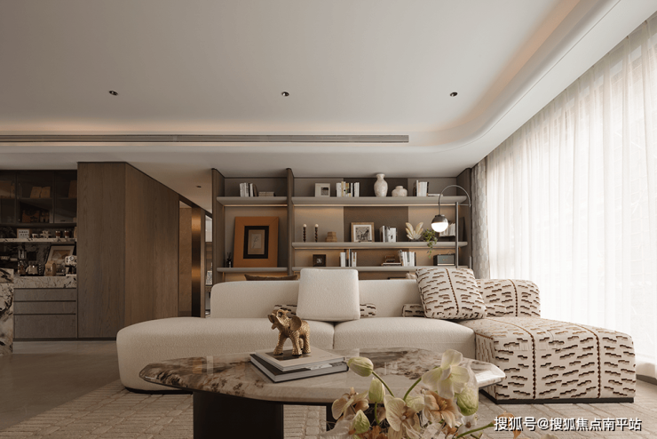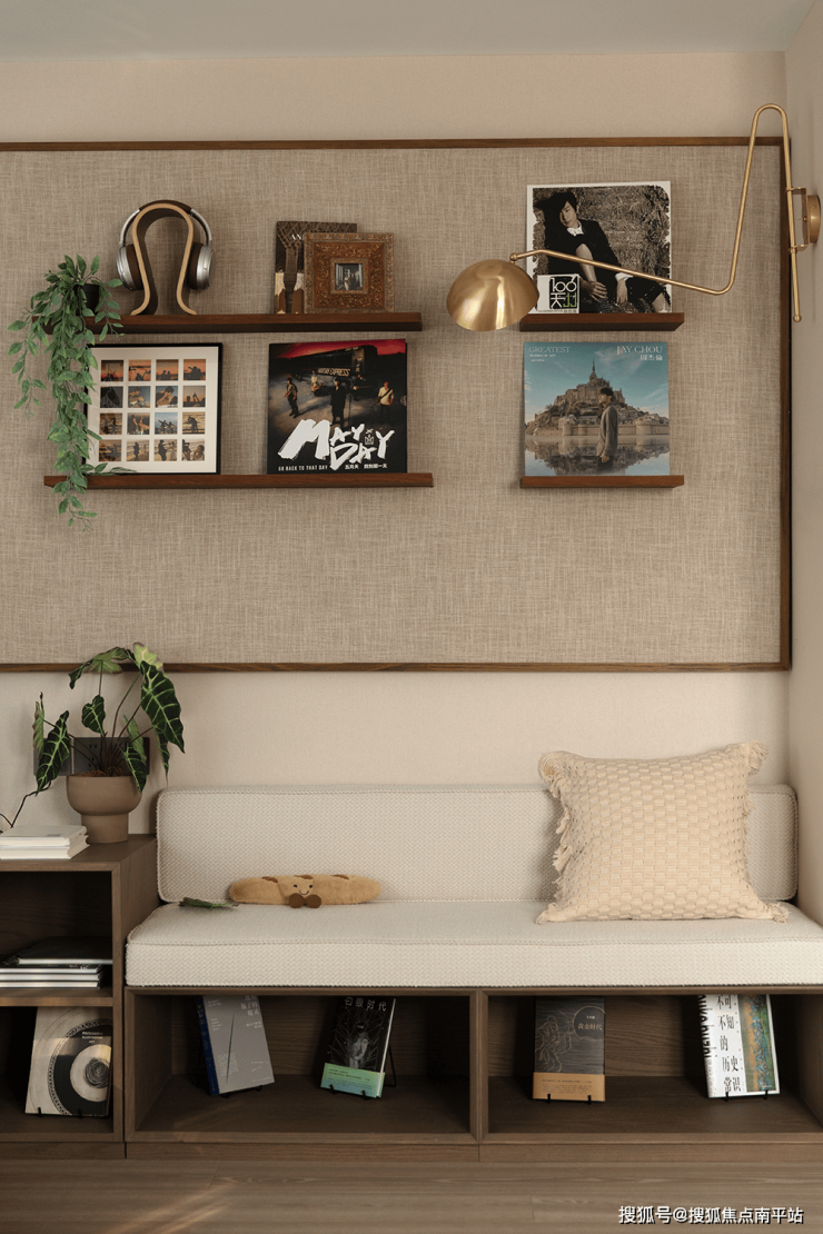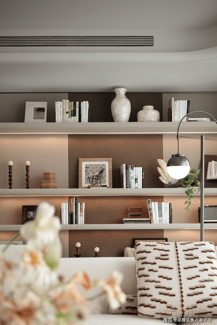 沙发背后,书架与艺术品悄然叠成一道精神山水。木格层叠,书籍纸页间藏着经年的折痕与走心的批注,是思想沉淀的痕迹;不逐整齐划一的陈列,反倒如自然生长的群落。