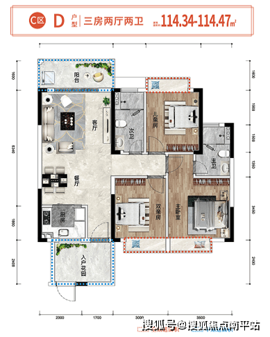 114㎡的三房两卫户型,也是爆款中的爆款!三开间朝南,南北对流,通风采光都超级好。早上拉开窗帘,阳光就能洒满整个房间,傍晚还有自然风穿堂而过,夏天都不用怎么开空调,住着又舒服又省电,改善型客户几乎都选这个户型。