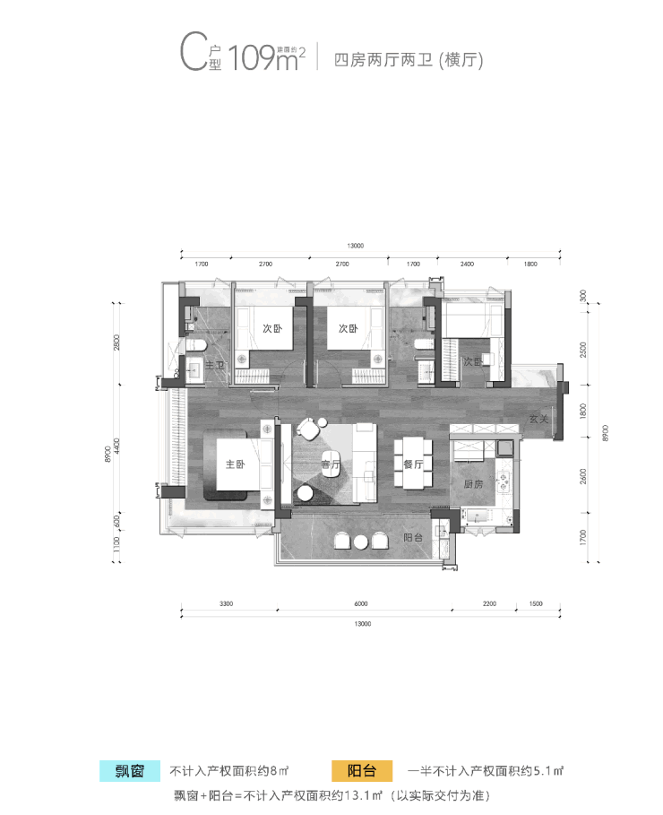 建筑面积约109㎡户型-4房2卫(横厅),大横厅设计,空间实用性更高,该户型使用率达到了98%。货量不多,稀缺性不言而喻。