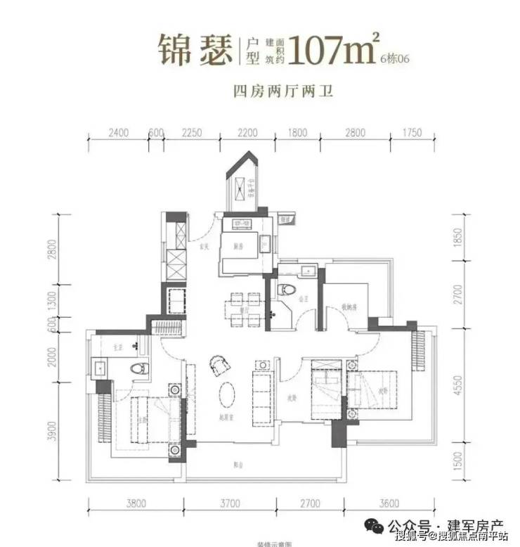 107㎡的4房2厅2卫 ,设计的是竖厅双龙抱珠格局,客厅3.7米开间,LDKB一体化设计,预留冰箱卡槽位,四开间朝南,主卧+2个次卧270°无柱转角飘窗,分别做到了主卧17.94㎡/次卧16.38㎡/次卧7.56㎡/次卧6.89㎡(包含墙体飘窗),U型厨房烟道外置,卫生间干湿分离, 得房率约104.06%(包含赠送) ,客厅连接次卧出超大阳台约11.76平,东北朝向。