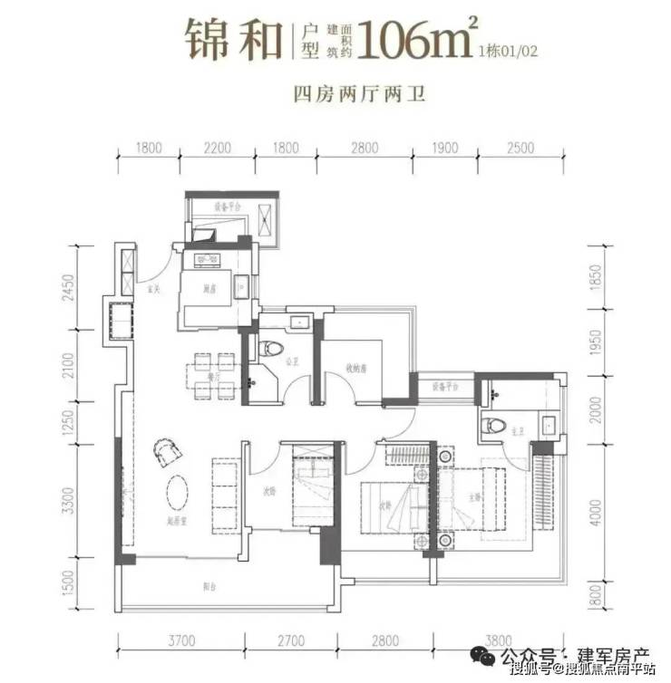 106㎡的4房2厅2卫 ,设计的是竖厅格局,客厅3.7米开间,LDKB一体化,S墙设计预留冰箱卡槽位,四开间朝南,动静分区,主卧270°无柱转角飘窗还带1个设备平台约1.52平,分别做到了主卧20.34㎡/次卧11.2㎡/次卧7.7㎡/次卧6.75㎡(包含墙体飘窗),U型厨房烟道外置,卫生间干湿分离, 得房率约101.16%(包含赠送) ,客厅连接次卧出大阳台约11.76平,东南朝向。