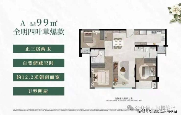 建面约 99㎡户型:“四叶草” 格局,全南向面宽约 12.2 米,配备 U 型明厨、独立生活阳台及储藏空间,为紧凑型三房两卫设计。