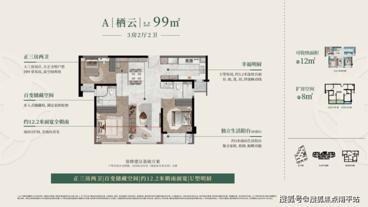 建面约99㎡户型主打刚需友好,三开间朝南超12米大面宽,保证室内充足采光;四叶草爆款格局,走道零浪费,方正三房+双卫+百变储藏间,完美匹配刚需家庭的居住需求;