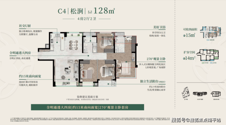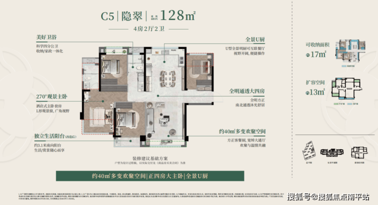 建面约128㎡户型C4户型为全明四房,超15米南向面宽保证全屋通透,U型全景厨房、带L型转角窗的奢享主卧套房,让改善生活的舒适感与仪式感拉满;C5户型则打造约40㎡多变欢聚区,成为家庭互动的核心空间,舒适四房+阔尺主卧套房,兼顾实用与品质;