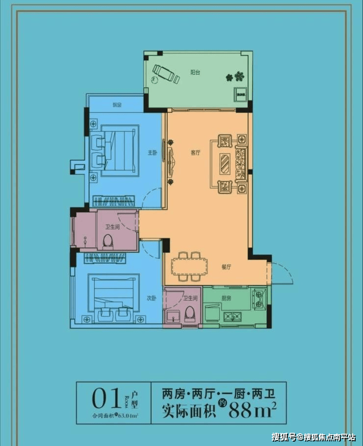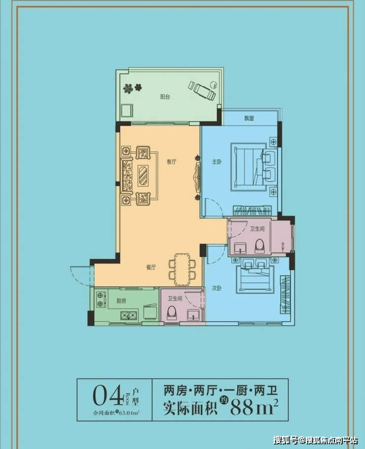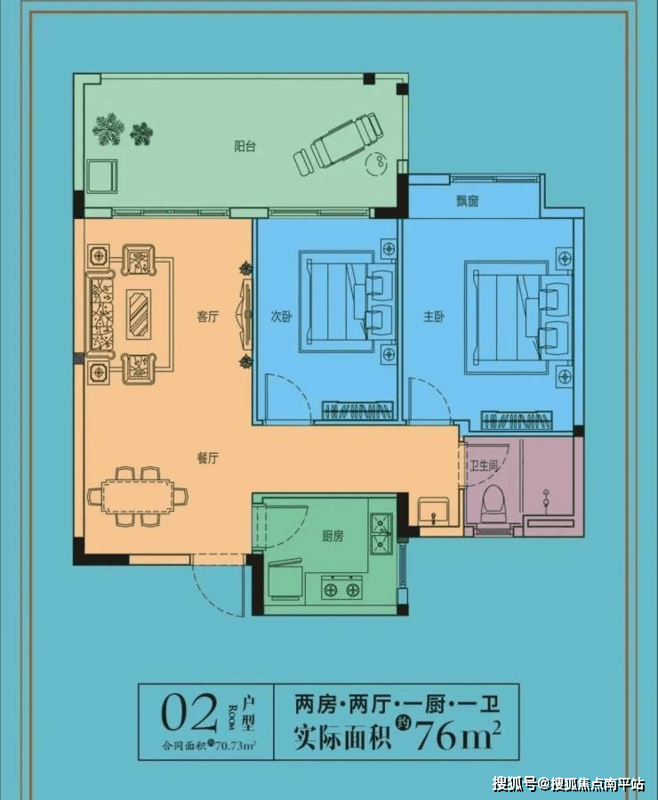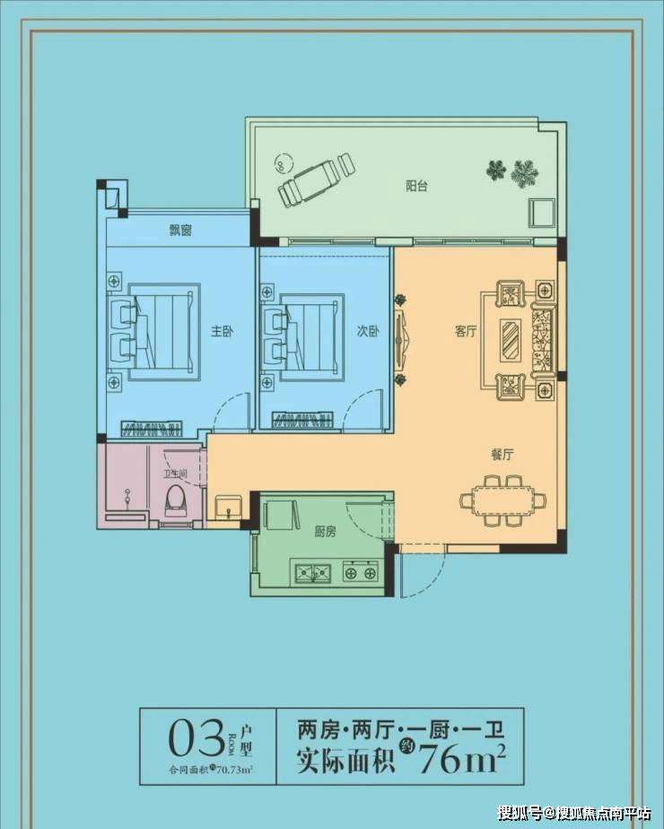 🏡02、03户型:两房两厅一卫,三面都是朝景观面,5.8✖2.4的大阳台,客厅开间3.4米