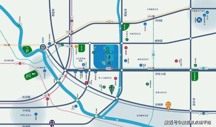 【路网】:四横四纵路网,四条横向主干线为卫国道、成林道、津滨大道、津路;四纵为红星路、中环线(顺达路)、快速路、外环线,这样的一个立体交通路网下,您能够与城市各个区域做自由切换。