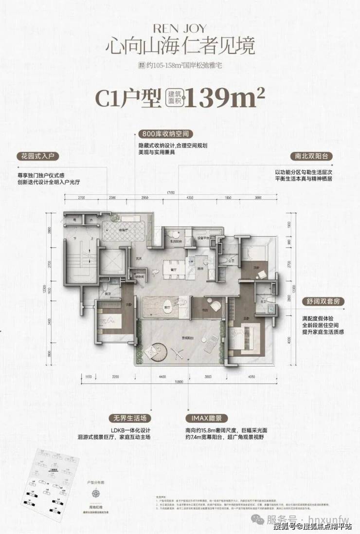 保利仁境139平效果图——四房三卫,赠送面积39平米 一梯一户,层高3.1米 270度全景入户花园,独立储物间 卧室270度转角大窗,客厅可改7.4米大横厅