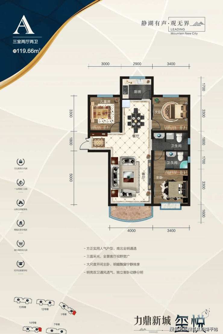 主力户型:100㎡(3室2厅1卫)、120㎡(3室2厅2卫)